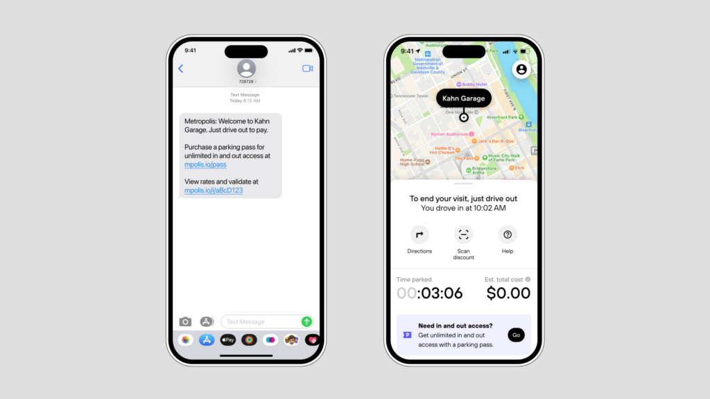 Your visit starts when you drive in, and your parking session will begin. You will receive a welcome text message which includes a link to purchase a pass.