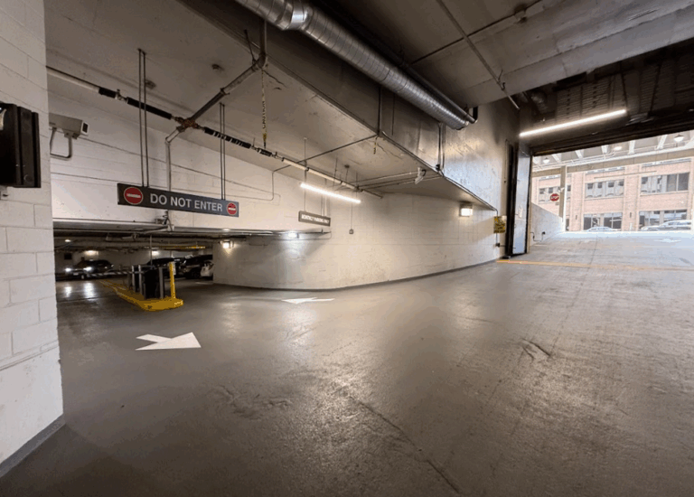 The entrance and exit for the lower garage is on Marquette Avenue and it shares the entrance with the dock. The sign that says “Deliveries/Contract Parking” is for the lower level garage. Please use caution and take the right turn to the gate.