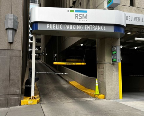 RSM Plaza has two garages. The upper garage is for public parking as well as contract parking. The lower garage is only for contract parking and requires a building access card to gain elevator access to the garage. We have staff on-site to assist with any issues exiting from 7am- 6pm.