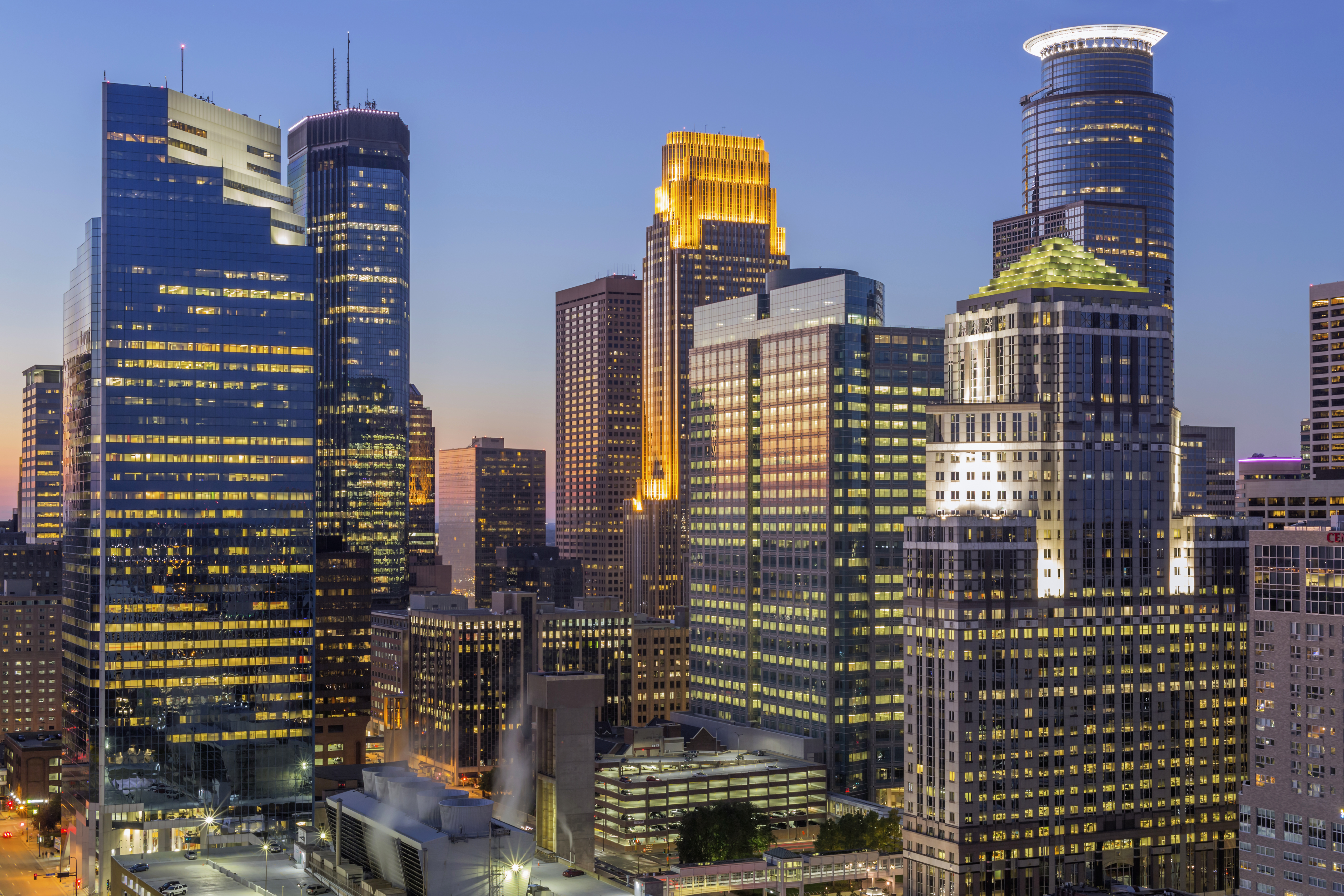 Colorful Minneapolis Skyscrapers Illuminated during Twilight